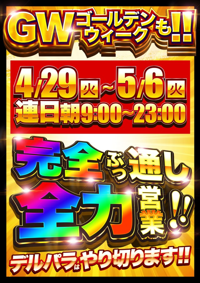 4/29(火)~5/6(火)GWも完全ぶっ通し全力営業!!