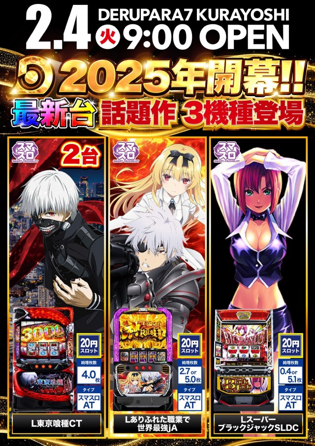 2/4(火)新台入替!!最新台も1パチ240台で遊べる!!