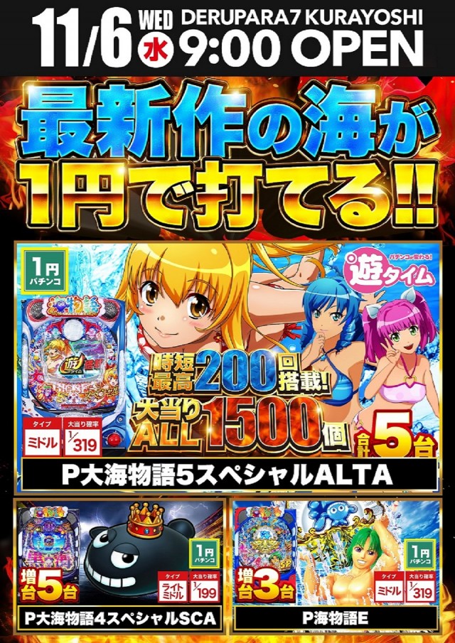 11月6日9時開店!!海最新台1円パチンコに登場!!