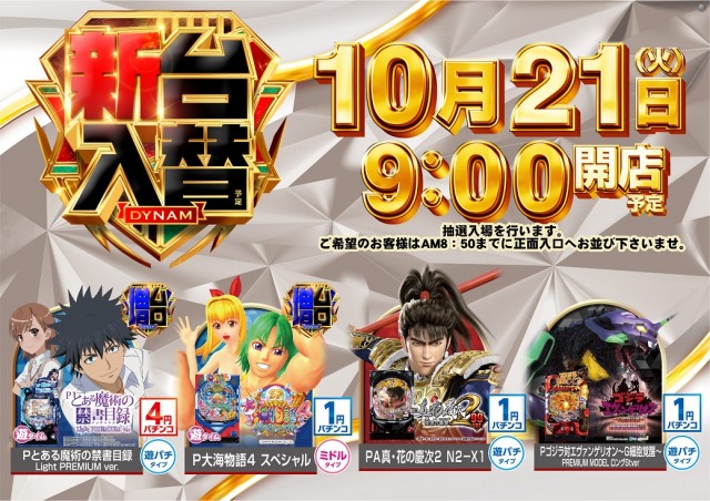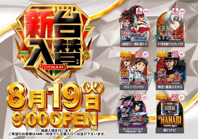 本日新台入替予定 パチンコ・スロット計6機種8台導入!
