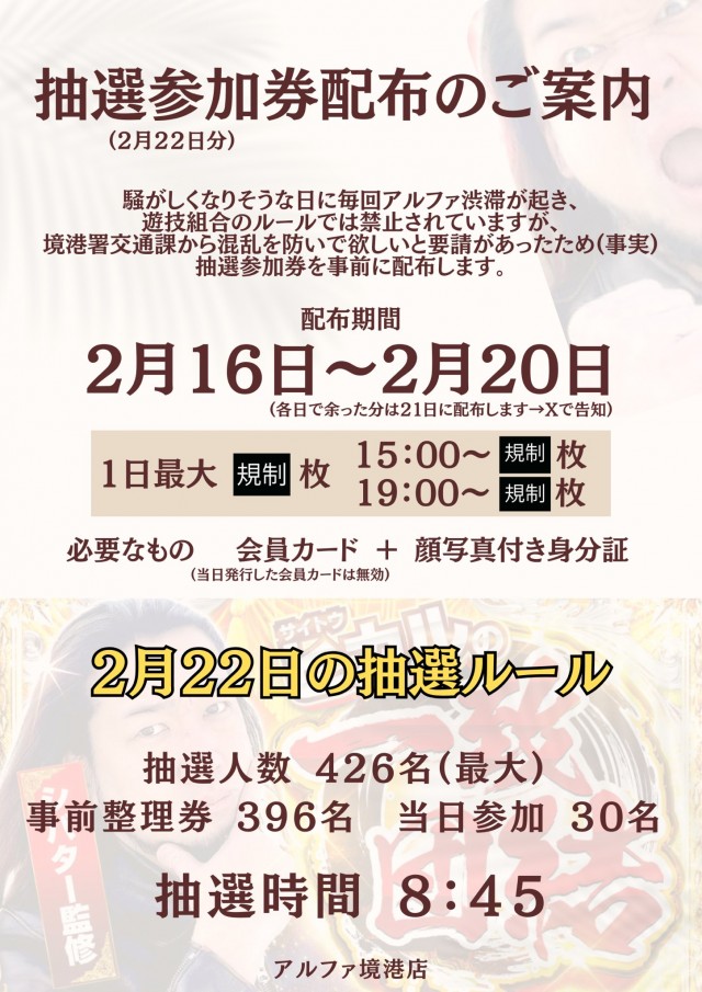 朝8:45までに所定の場所にお並び下さい。並び順で抽選機にて抽選を行います。入場はさんしろう側出入口からの入場となります。 |