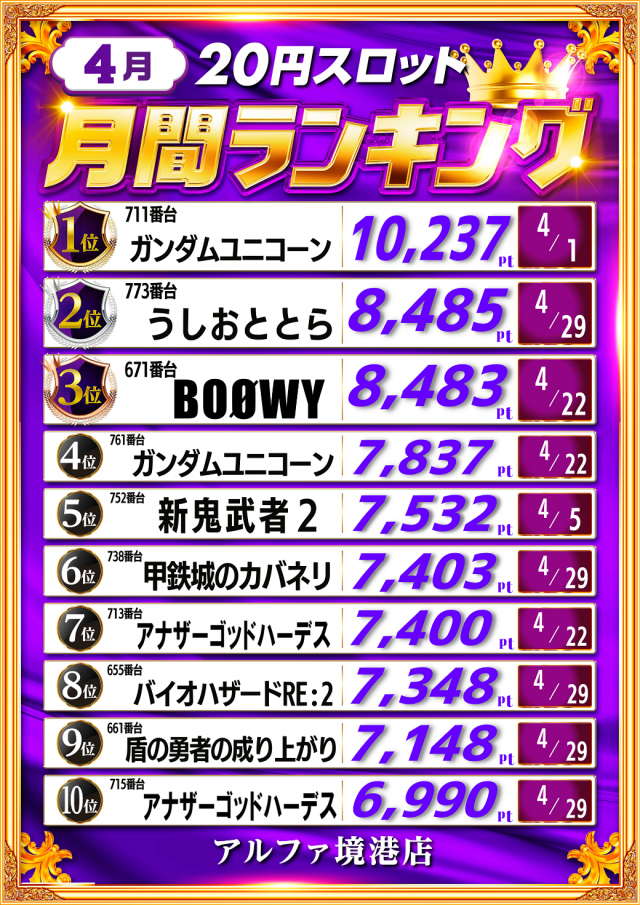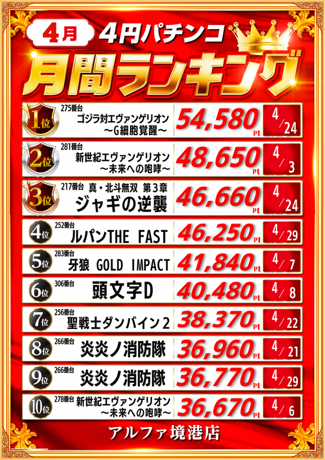 パチンコ[4]、[1]、[0.2] スロット[1000円/46枚]、[5] |