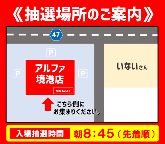 朝8:45までに所定の場所にお並び下さい。並び順で抽選機にて抽選を行います。入場はさんしろう側出入口からの入場となります。 |