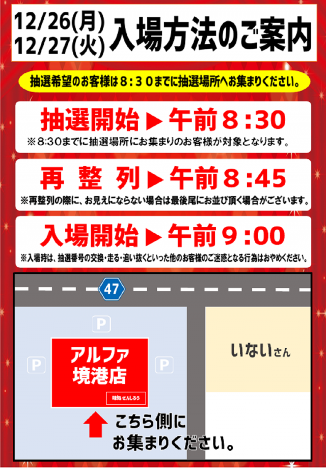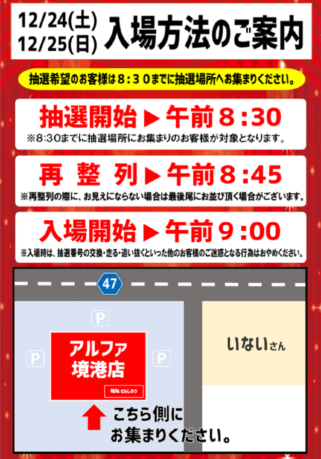 朝8:45までに所定の場所にお並び下さい。並び順で抽選機にて抽選を行います。入場はさんしろう側出入口からの入場となります。 |