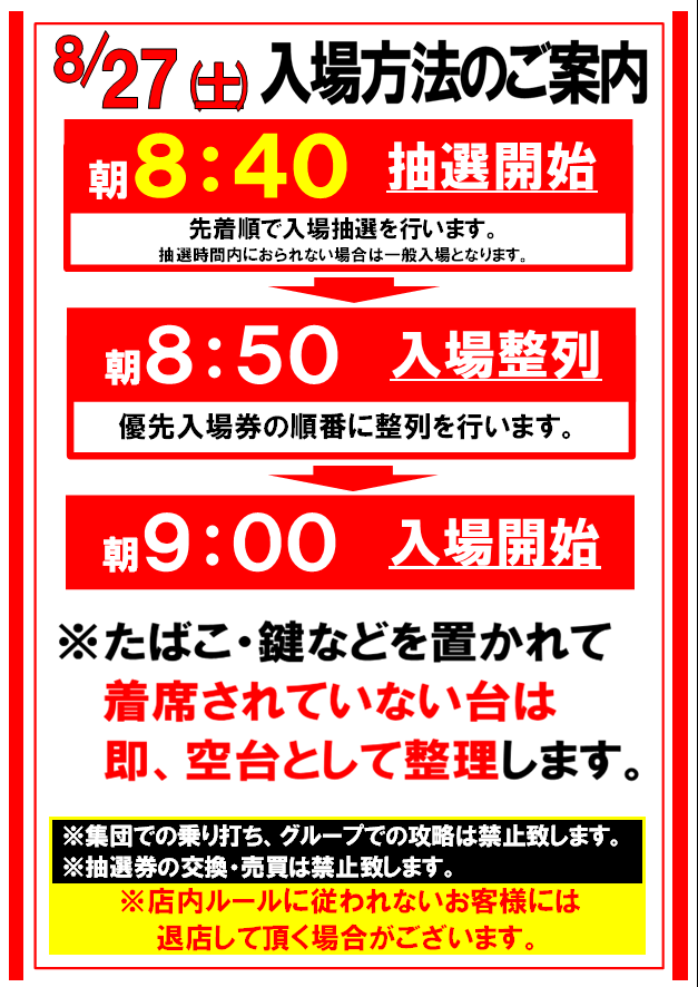 朝8:45までに所定の場所にお並び下さい。並び順で抽選機にて抽選を行います。入場はさんしろう側出入口からの入場となります。 |