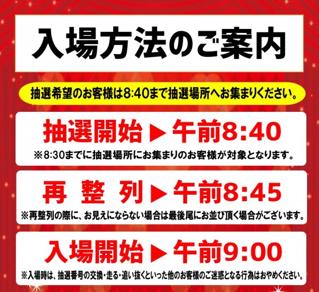 朝8:45までに所定の場所にお並び下さい。並び順で抽選機にて抽選を行います。入場はさんしろう側出入口からの入場となります。 |