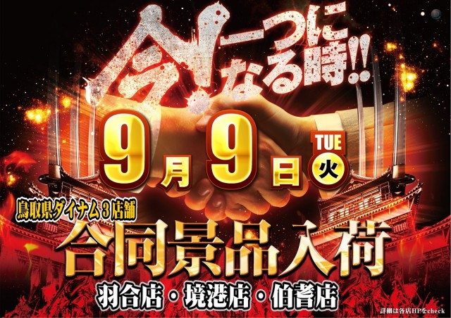 9月9日(火)新台入替&鳥取県ダイナム合同景品入荷予定!