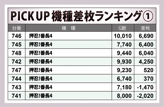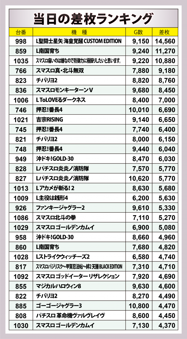 また、『スマスロ真・北斗無双』の+9,200枚弱、『スマスロモンキーターンⅤ』が+8,500枚弱、『L ToLOVEるダークネス』の+7,000枚超、『吉宗RISING』の+6,700枚弱、『沖ドキ!GOLD-30』では+6,000枚超&+5,000枚弱が1台ずつ、『Lアカメが斬る!2』の+5,700枚弱、『L主役は銭形4』の+5,600枚超、『ファンキージャグラー2』の+5,300枚超、『スマスロ北斗の拳』の+5,300枚弱、『スマスロ ゴールデンカムイ』では+5,100枚弱&+4,400枚弱が1台ずつと続いた。
