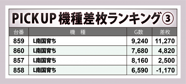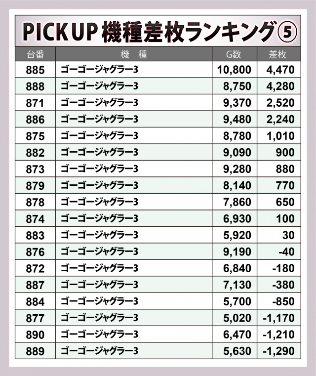 さらに、『ゴーゴージャグラー3』がボーナスタイプらしい安定性を発揮しており、+4,000枚オーバーが2台生じていたことも見逃せない。