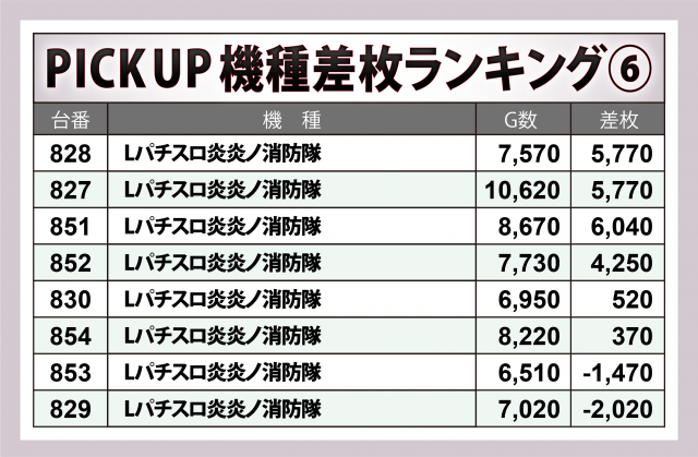 こちらに続いて、『チバリヨ2』では+8,800枚弱&+6,200枚弱&+4,500枚弱が1台ずつ、『押忍!番長4』では+6,700枚弱&+6,400枚超&+6,000枚超が1台ずつ、『Lパチスロ炎炎ノ消防隊』では+5,800枚弱が2台と、どこに視線を合わせても素晴らしい数字に溢れていた。