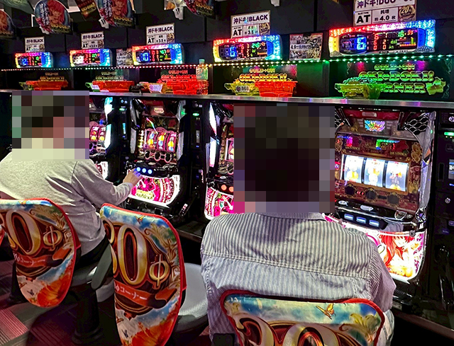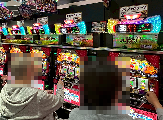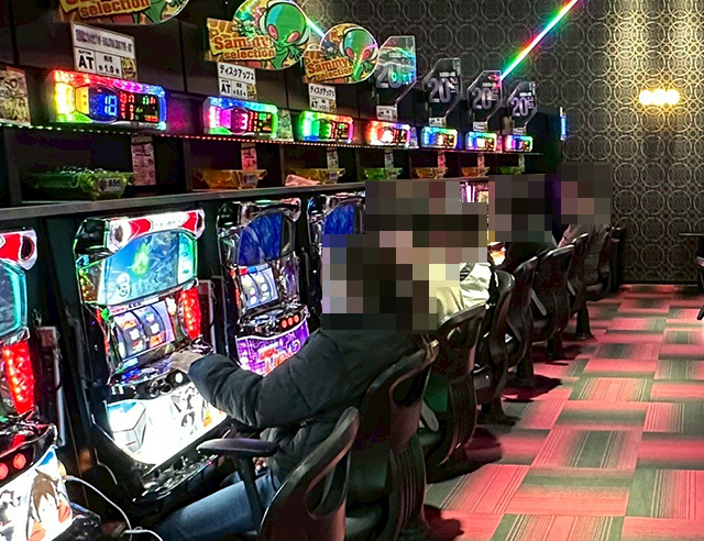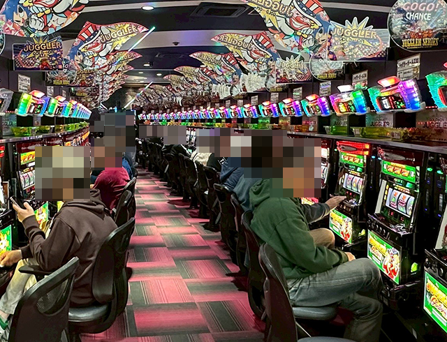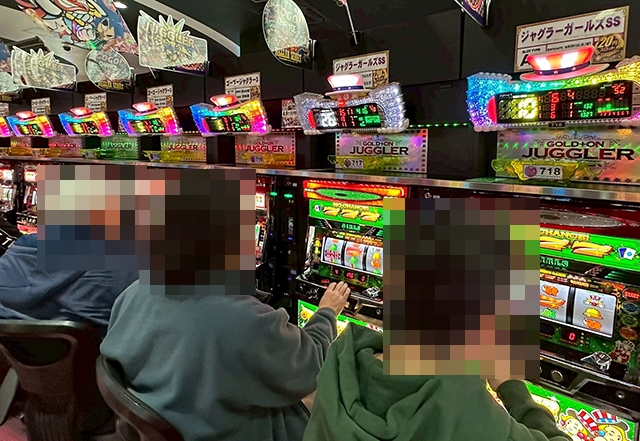 「ジャグラーガールズSS」や「ゴーゴージャグラー3」などにも、持ち玉を使って遊技をおこなっているプレイヤーがおり、シマ全体に華やかな光景が広がっていた。