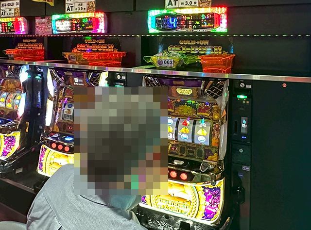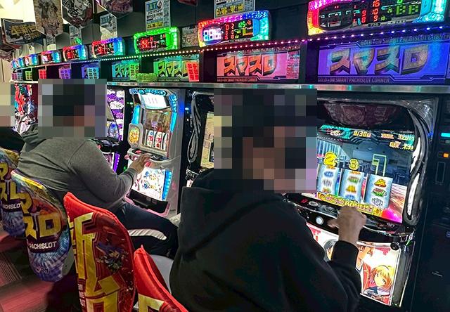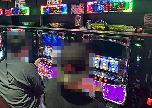 取材時は、2台設置の「パチスロディスクアップ2」に空き台がなく、どちらのプレイヤーも持ち玉を使って遊技中。