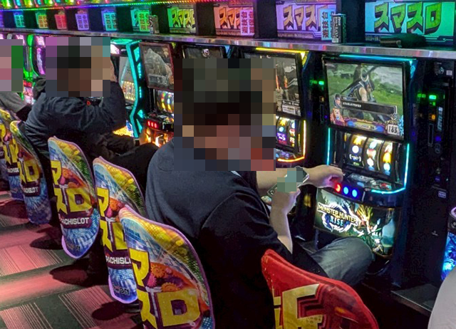 14時をまわった頃は、「スマスロモンキーターンV」や「スマスロ モンスターハンターライズ」などで、プレイヤーが晴れやかな表情で遊技中。