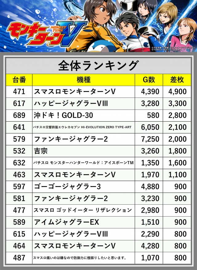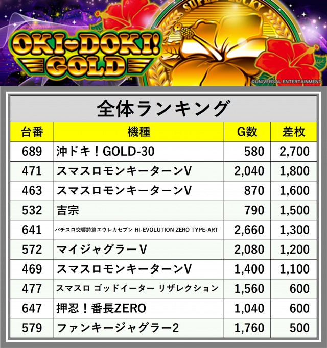 厳選された取材対象機種をはじめ、その他スロット全体から好記録が飛び出した!プレイヤーが楽しんだ1日を下記データにて振り返ってみて欲しい。