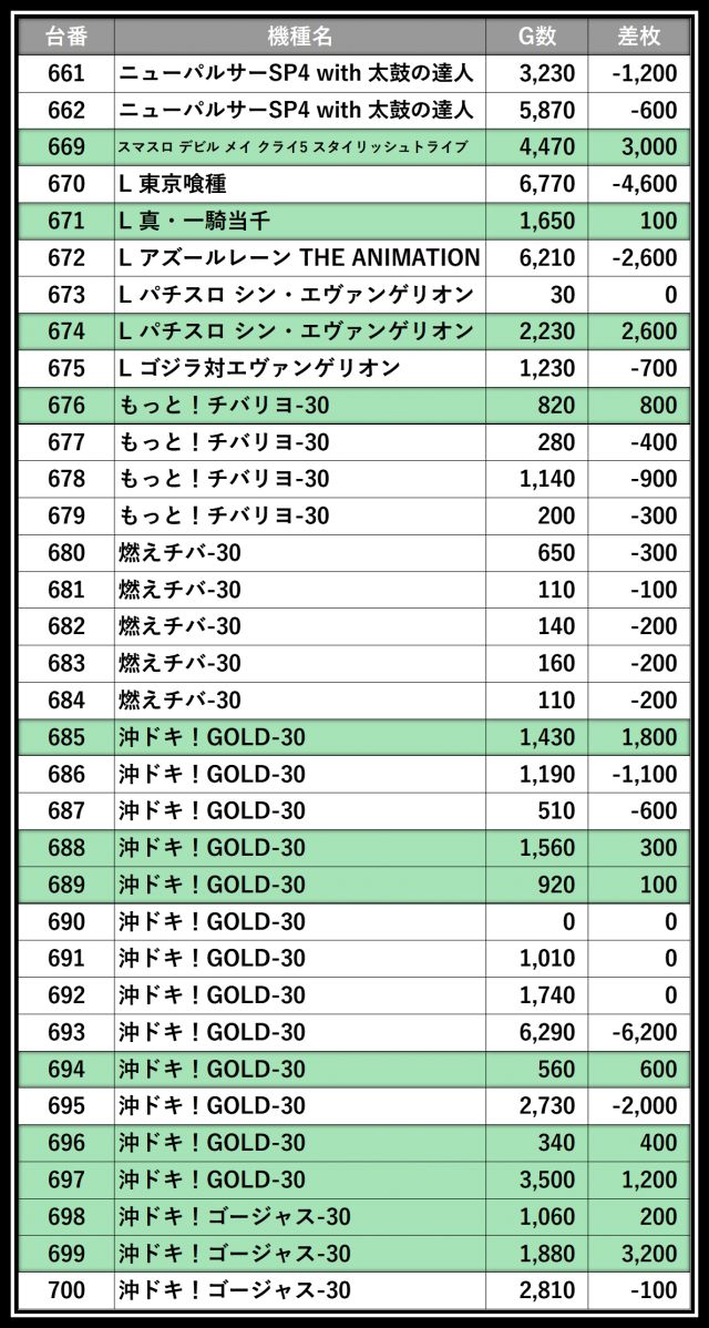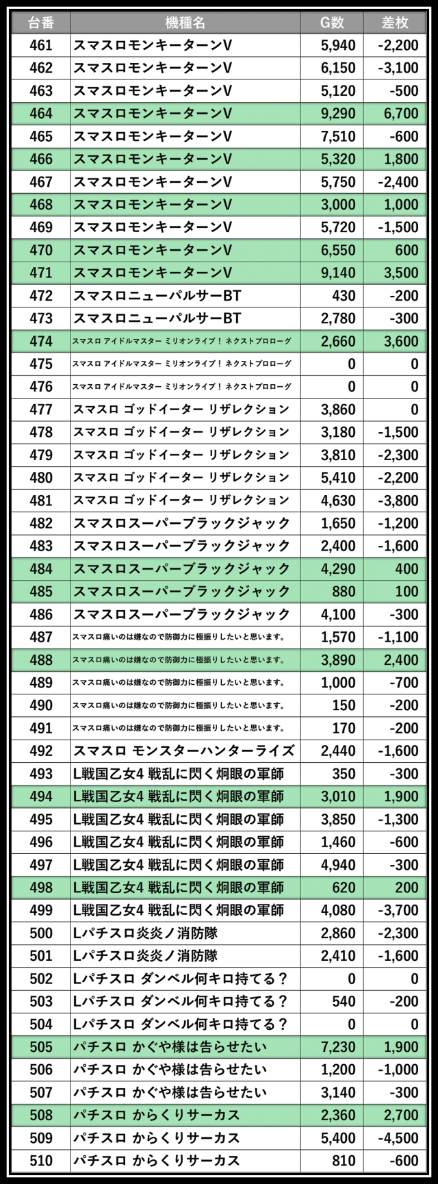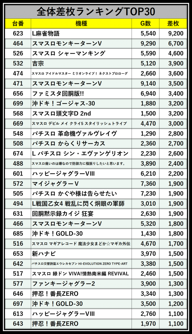 ※差枚数順に掲載しています
