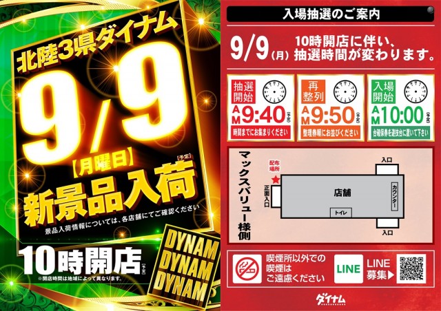 9/9(月) 10時開店予定!北陸3県ダイナム 新景品入荷!