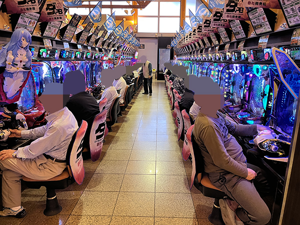 15時ごろの4円パチンコを見てみると「P大海物語4スペシャル」や「ぱちんこ シン・エヴァンゲリオン Type レイ」、「新世紀エヴァンゲリオン〜未来への咆哮〜」が高稼働。プレイヤーが嬉しそうに打ちこむ様子を多数確認している。
