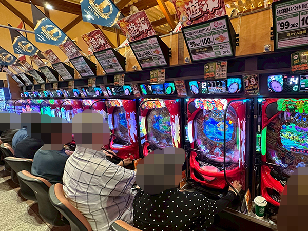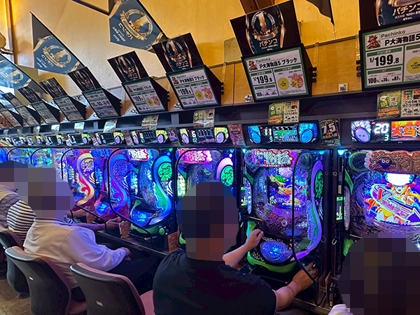 15時ごろの100円/89玉パチンコをチェックすると「P大海物語5 ブラック」や「PA大海物語4スペシャル Withアグネス・ラム」などの海物語シリーズが盛況の様子。プレイヤーたちの満足気な表情が印象に残っている。