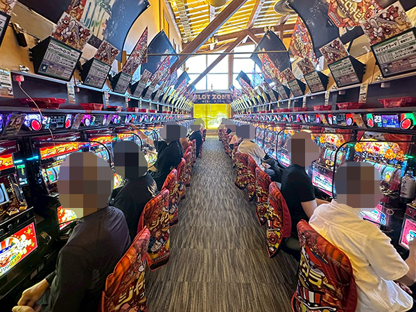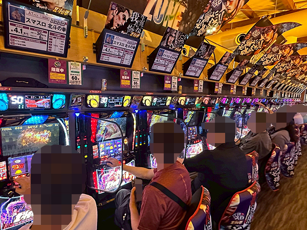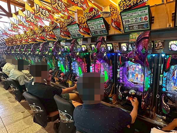 取材時は多くのプレイヤーが来店。パチンコ・パチスロともに、様々な機種が支持を得ていた。