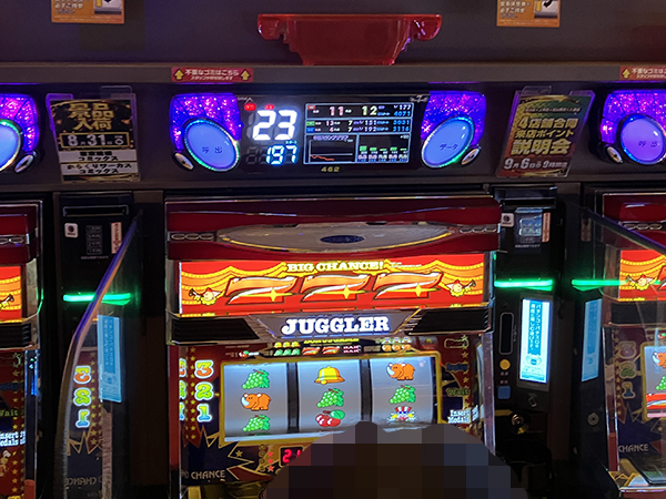 1000円/46枚パチスロを見渡すと、「マイジャグラーⅤ」や「アイムジャグラーEX」で理想的な展開を迎えたプレイヤーが見られ、シマ全体に華やかな光景が広がっていた。