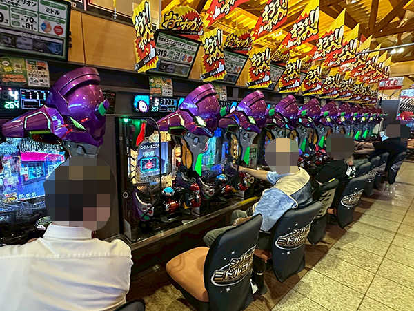 4円パチンコは「新世紀エヴァンゲリオン〜未来への咆哮〜」などエヴァシリーズの支持が厚い。遊技を楽しむプレイヤーたちの姿が印象に残っている。