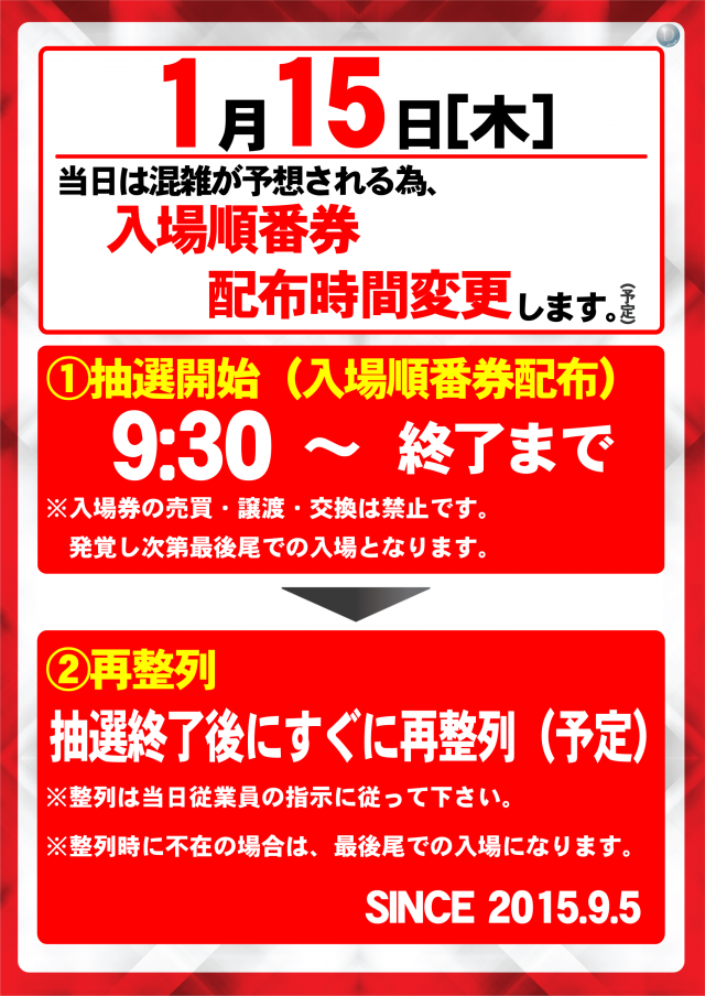 1月15日(木) 抽選開始9:30(予定)