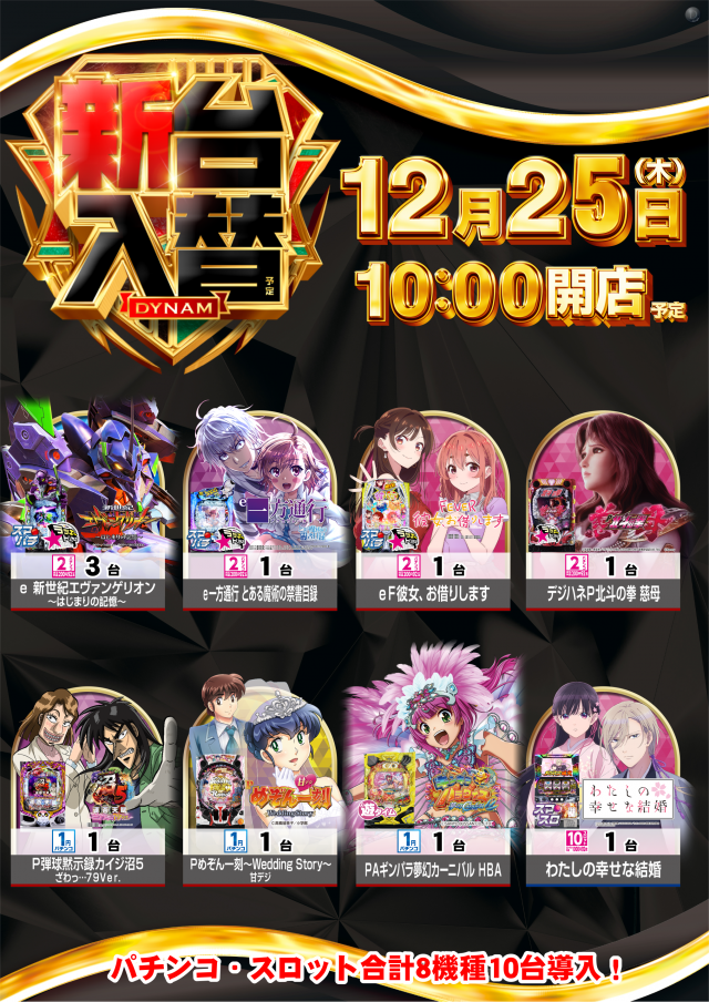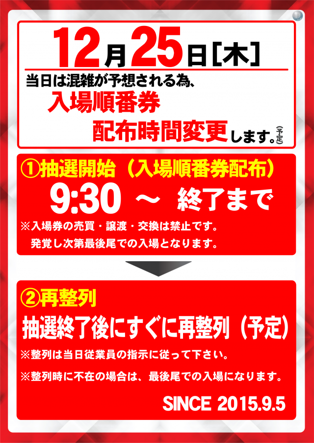 12月25日(木) 新台入替 抽選開始9:30(予定)