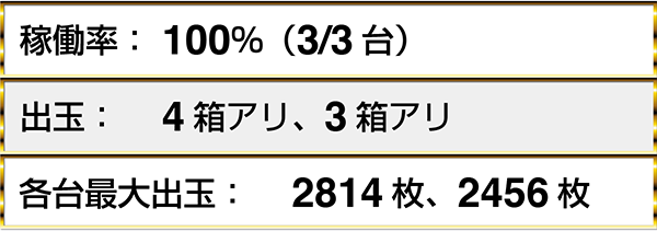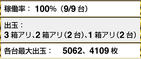設置されている9台すべてが稼働していた『押忍!サラリーマン番長』は2台の最大獲得出玉が4000枚を突破。