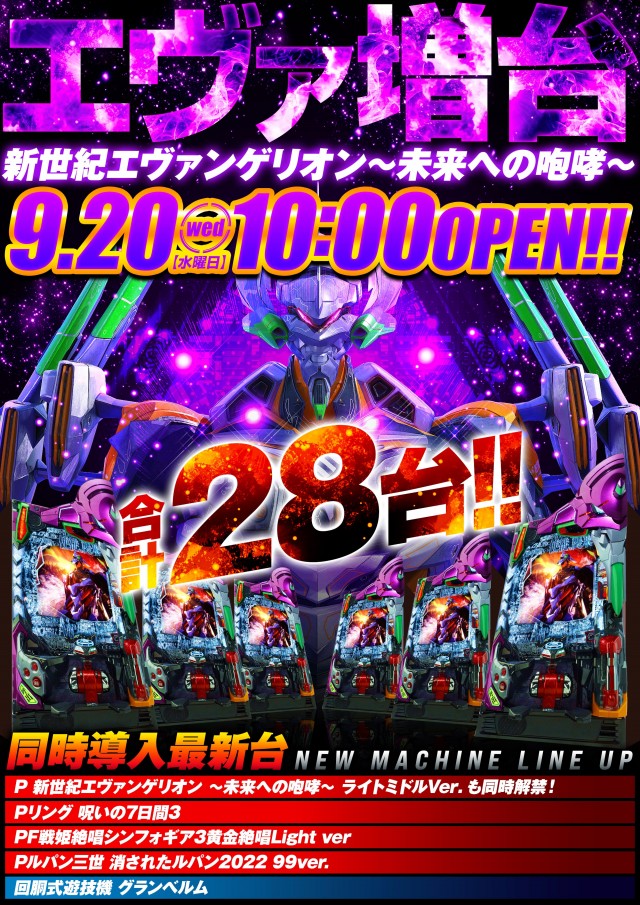 20日(水)新台入替!エヴァ~未来への咆哮~全28台へ増台!