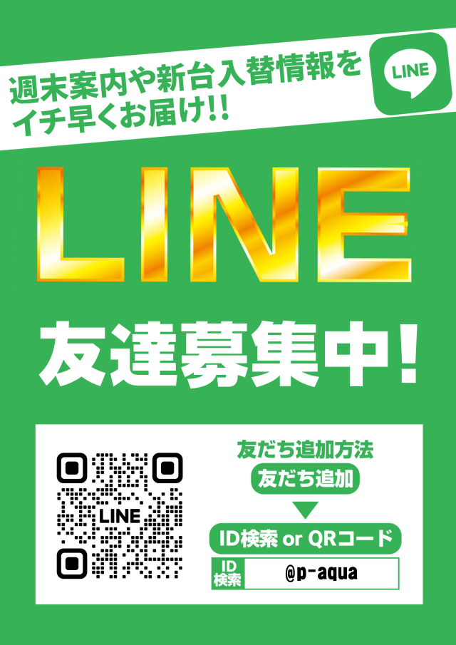 パチンコアクア 本日、新台入替初日!!全館朝10時開店!!