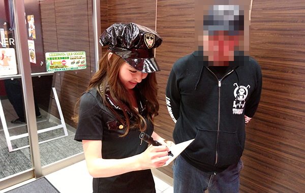 ミニスカポリス風コスチュームに着替えて、まずはお客様にご挨拶。