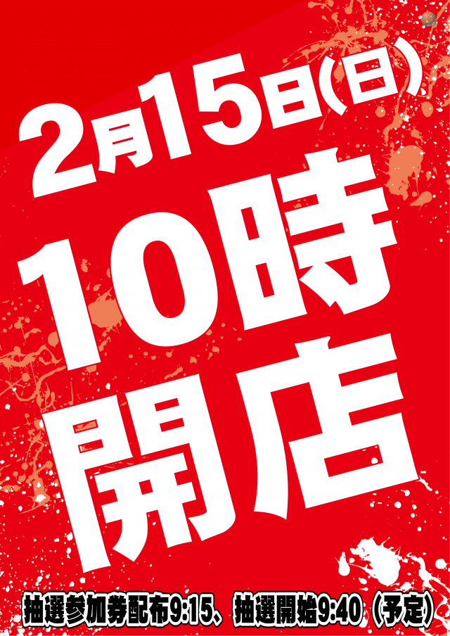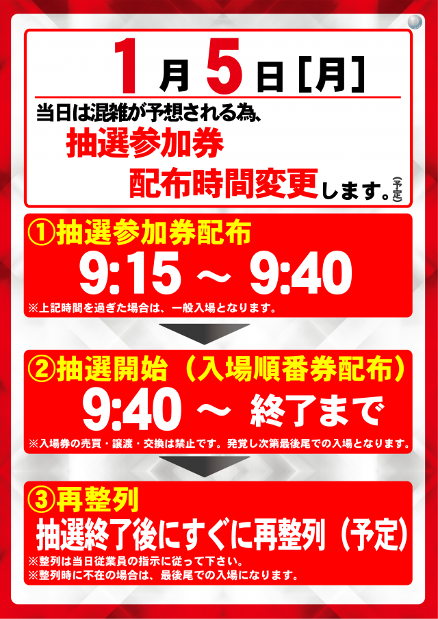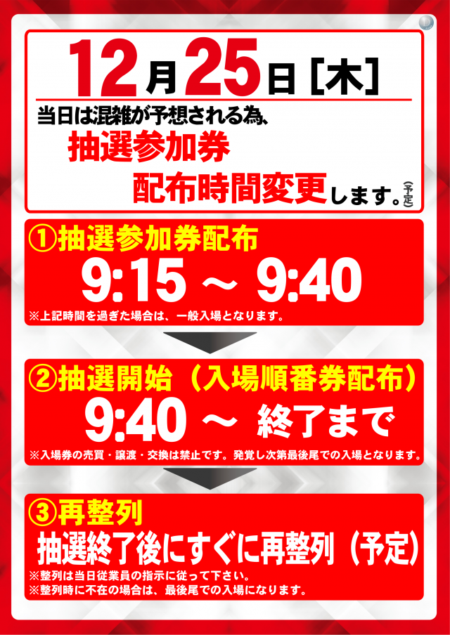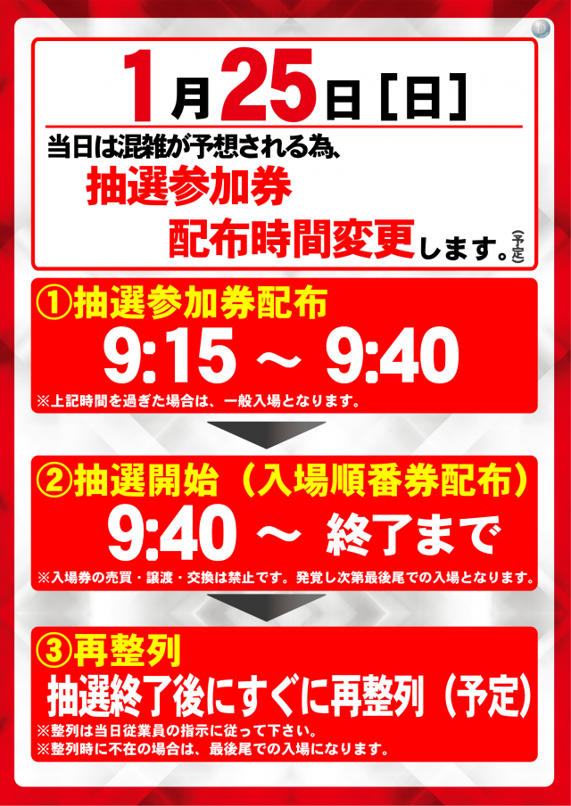 参加券配布9:25~9:40 抽選開始 9:40 再整列 9:55 入場開始 10:00 抽選時間が変更になる場合もございます |