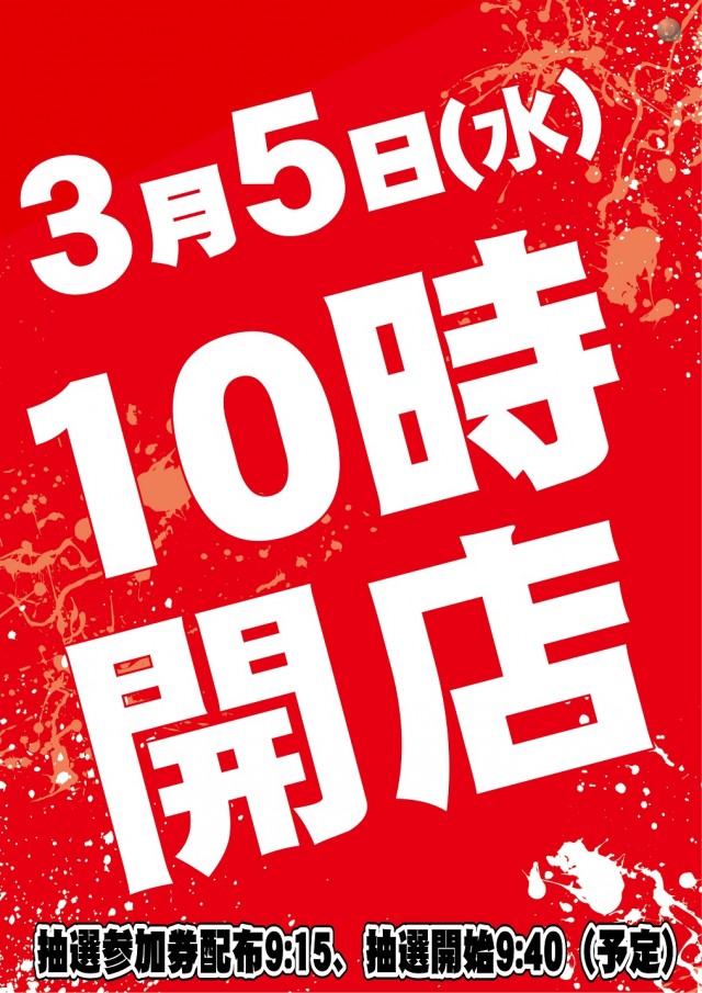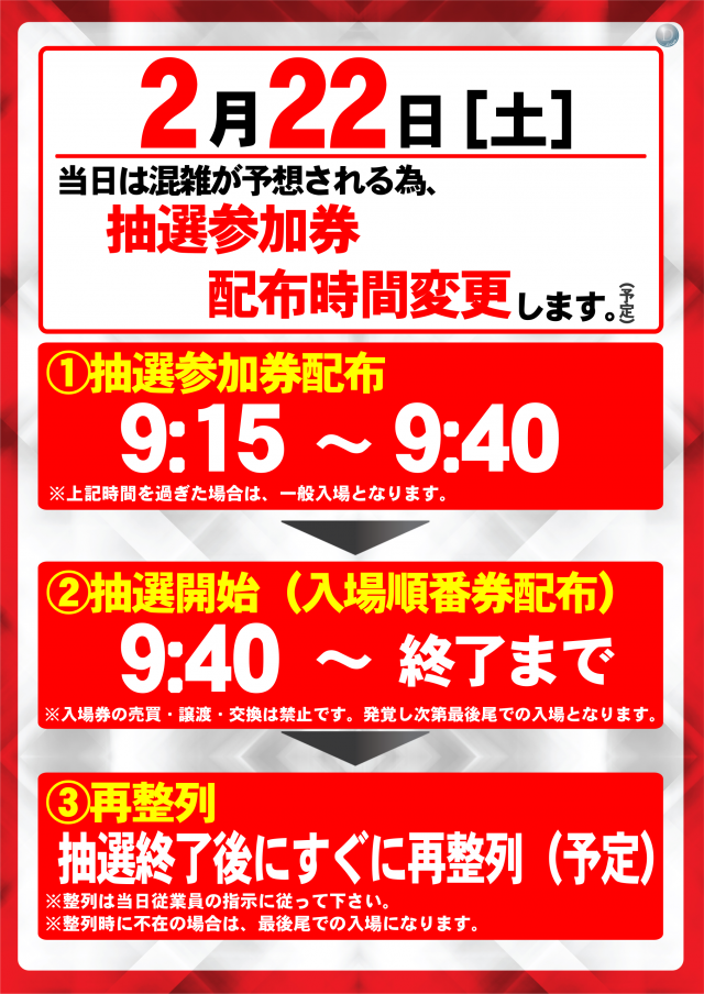 本日2月22日(土) 抽選参加券9:15配布(予定)