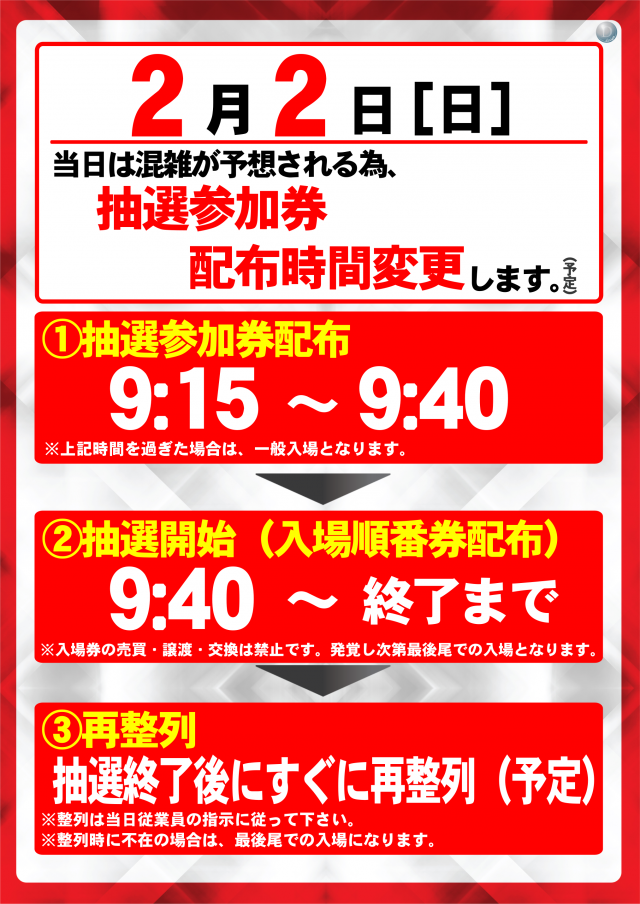 本日2月5日(水) 抽選参加券9:15配布(予定)