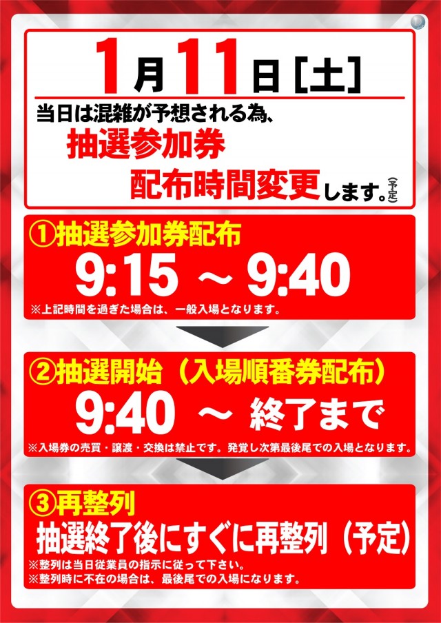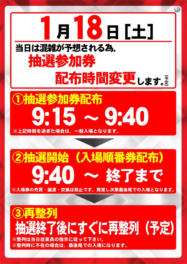 本日1月18日(土) 抽選参加券9:15配布(予定)