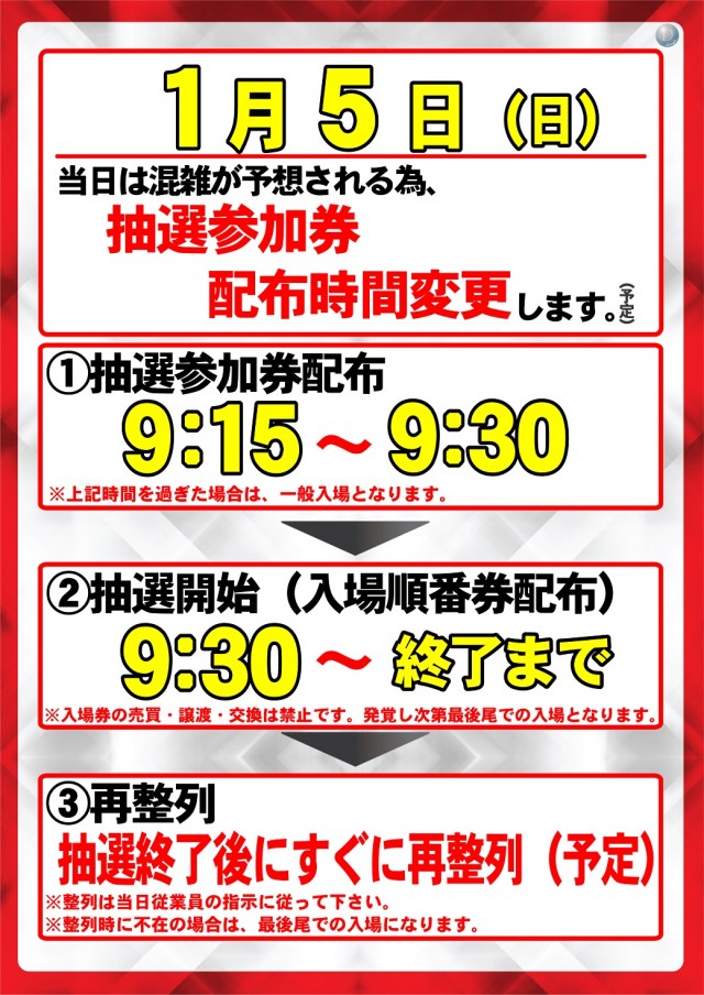 本日1月5日(日) 抽選参加券9:15配布(予定)