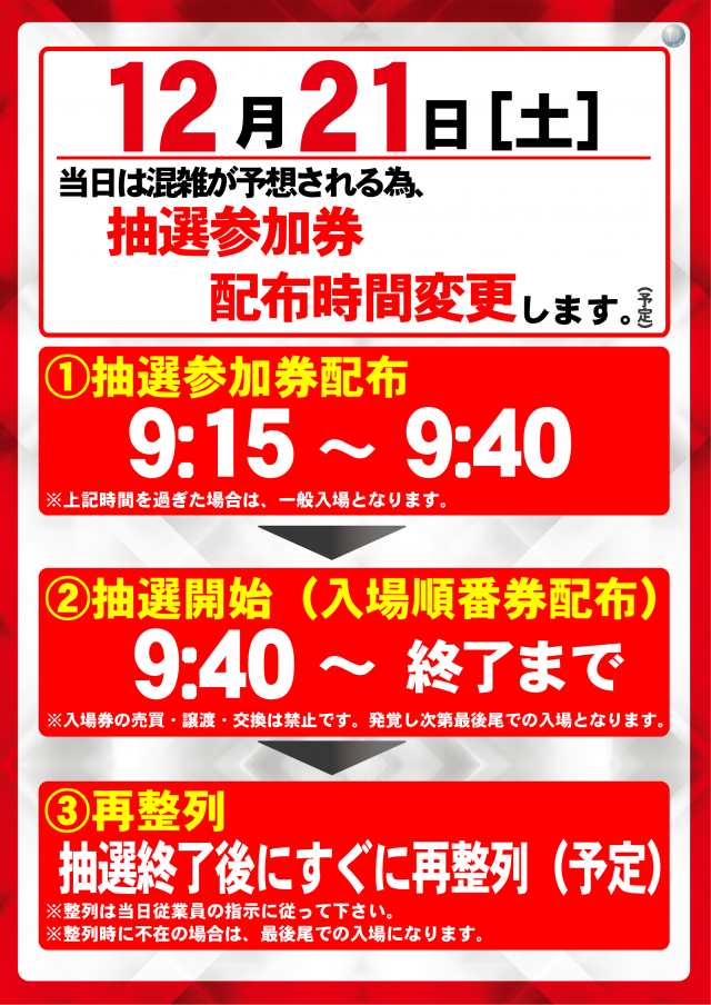 本日12月21日(土) 抽選参加券9:15配布(予定)