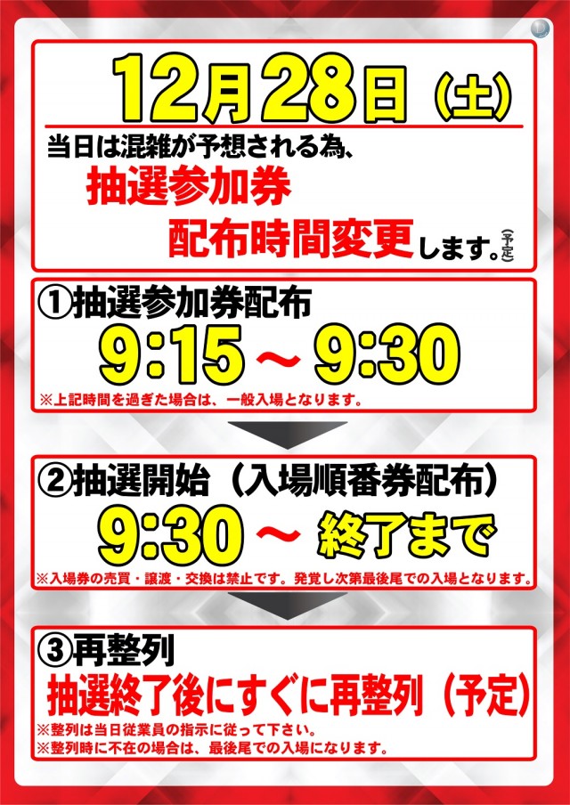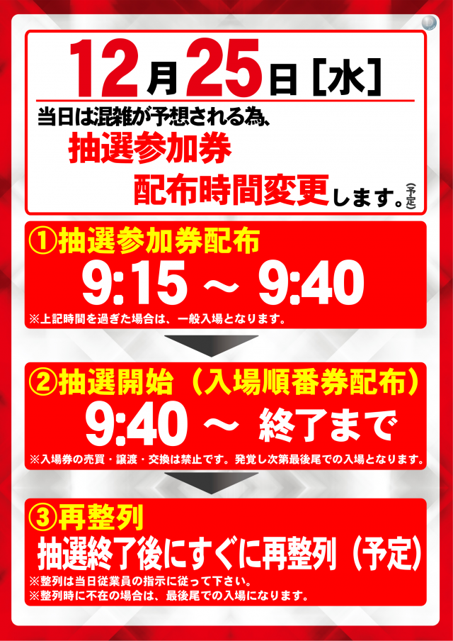本日12月25日(水) 抽選参加券9:15配布(予定)
