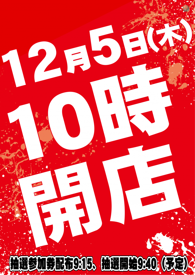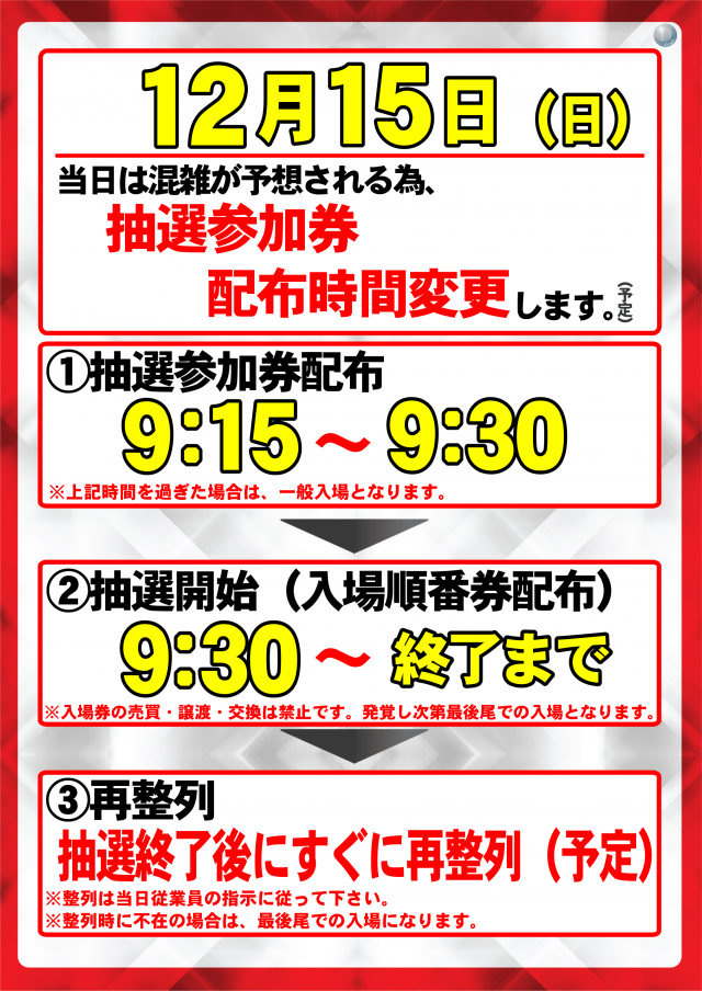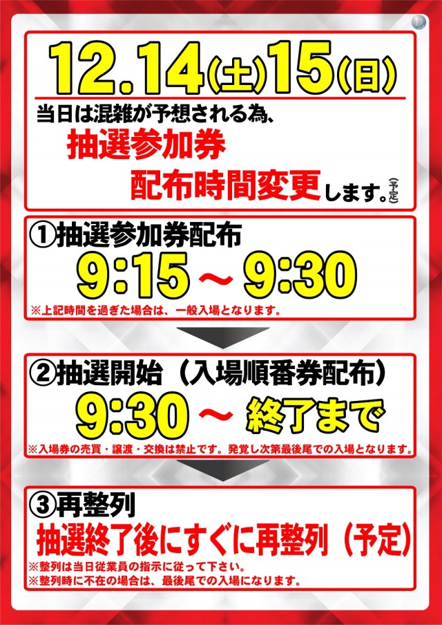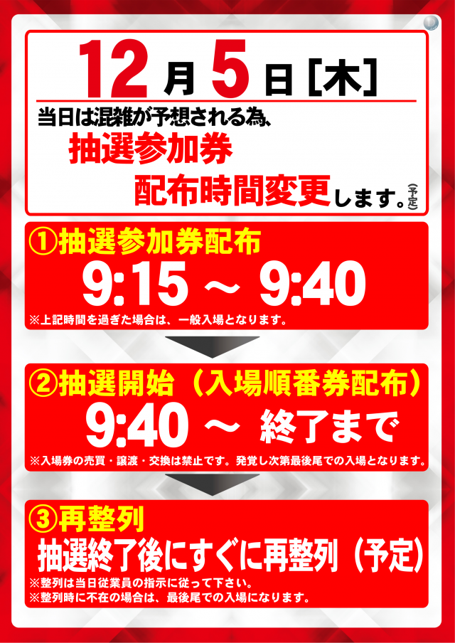本日12月5日(木) 抽選参加券9:15配布(予定)