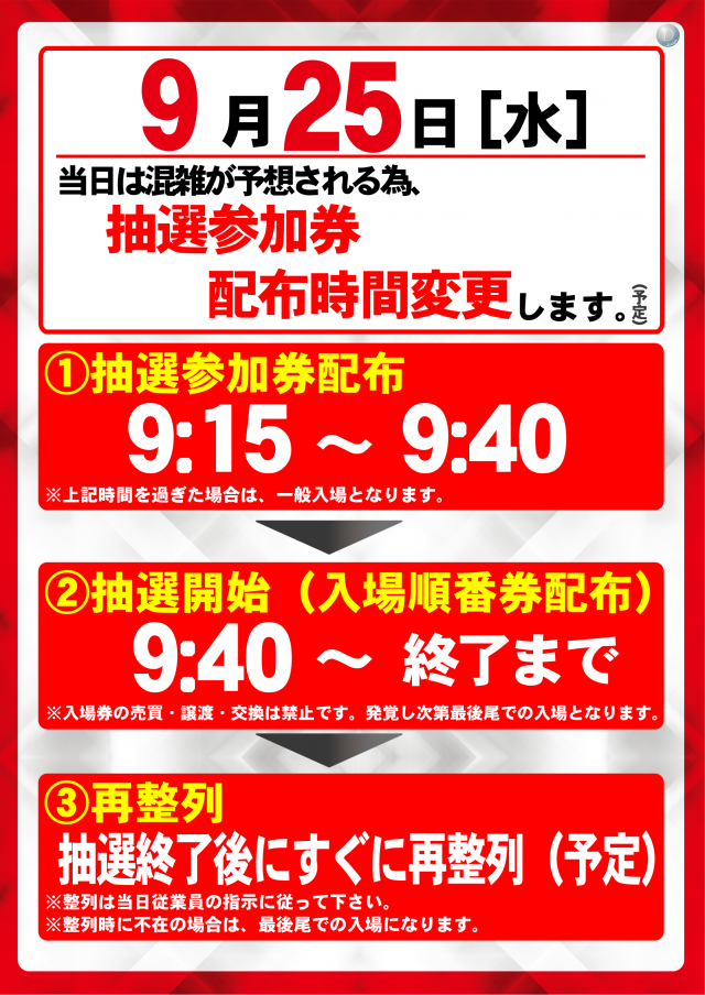 本日9月25日(水) 抽選参加券9:15配布(予定)