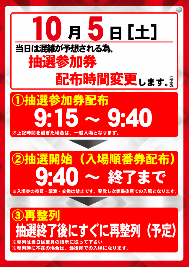 本日10月5日(土) 抽選参加券9:15配布(予定)