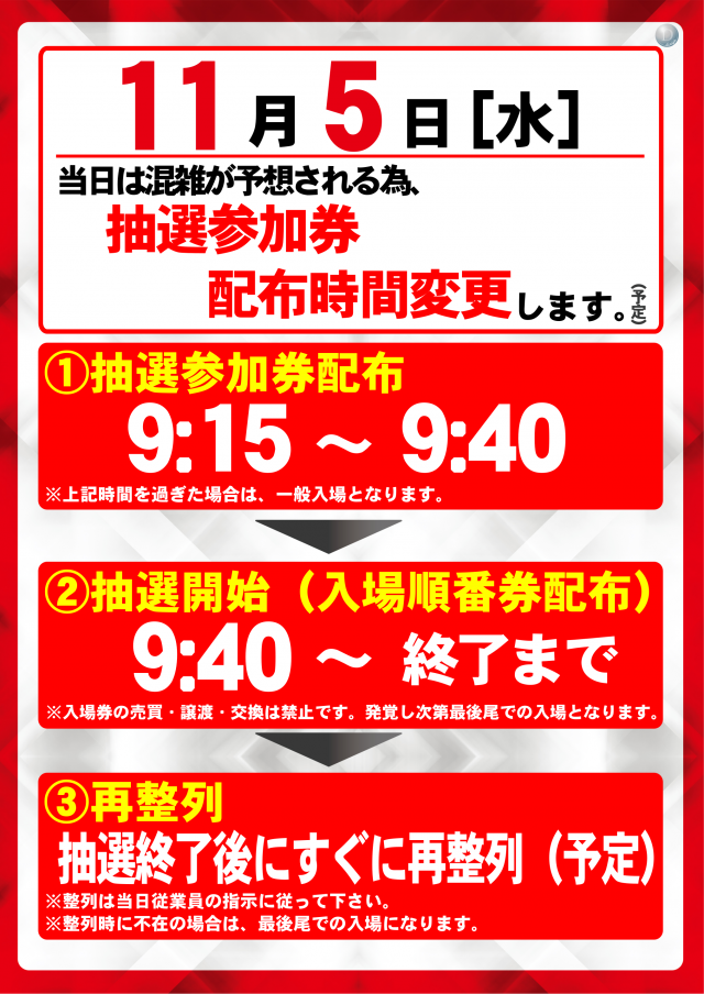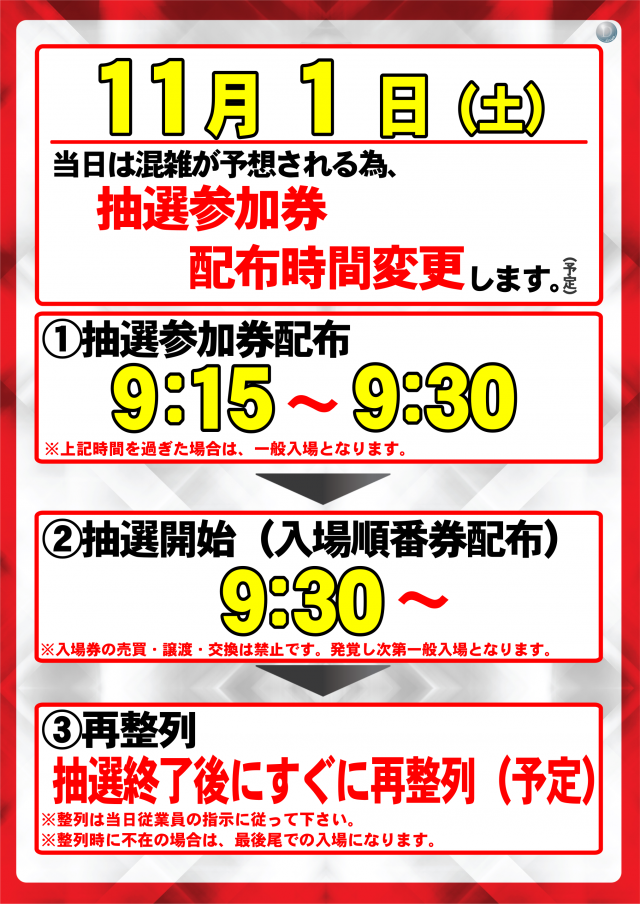 10月25日(土) 抽選参加券9:15配布(予定)