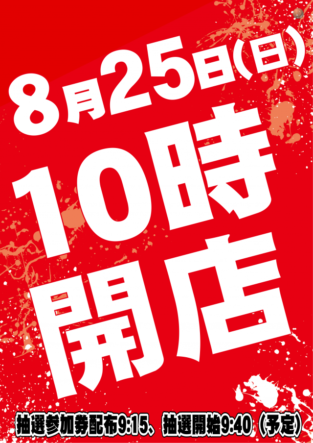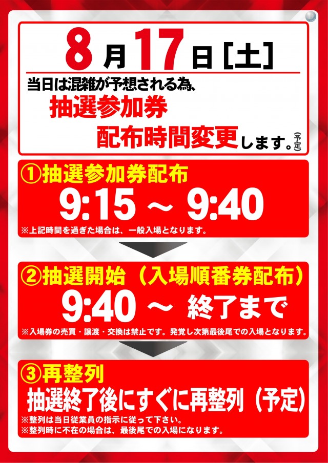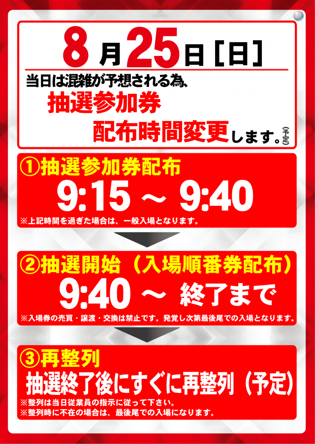 本日8月25日(日) 抽選参加券9:15配布(予定)