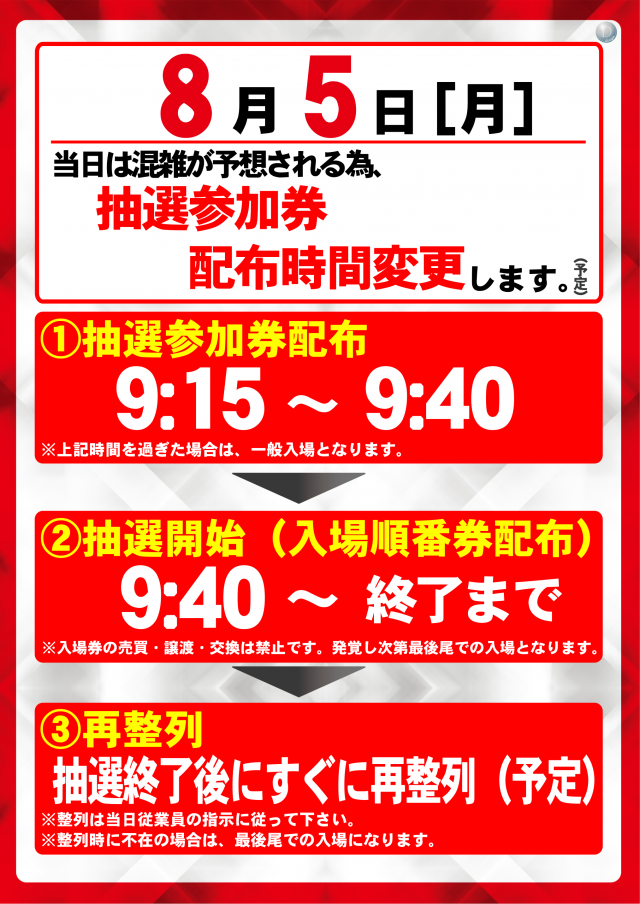 本日8月5日(月) 抽選参加券9:15配布(予定)