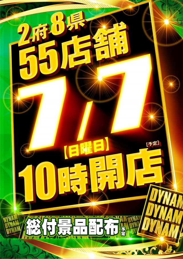 明日7月7日2府8県ダイナム55店舗 全店10時開店!