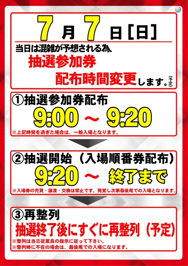 本日7月5日(金) 抽選参加券9:15配布(予定)