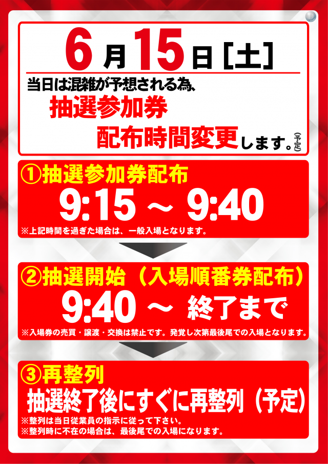 本日6月15日(土) 抽選参加券9:15配布(予定)