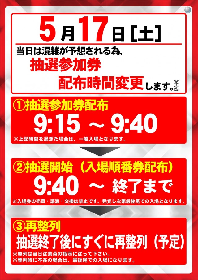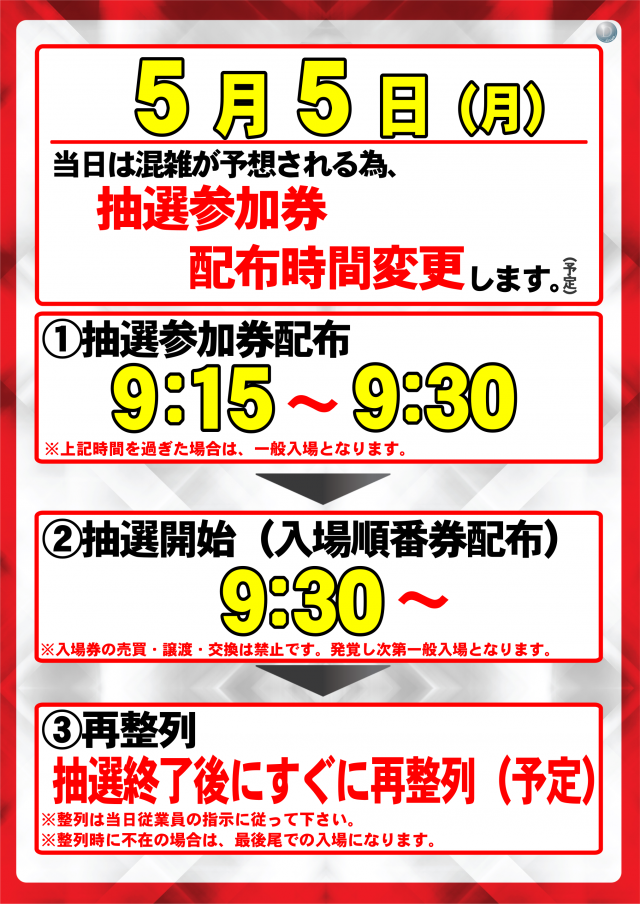 5月5日(月) 抽選参加券9:15配布(予定)
