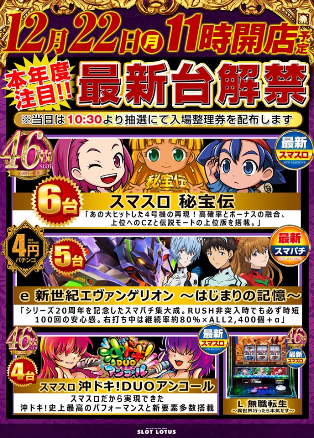 明日12月2日(火)は最新台10時開店のLOTUSへ🌈