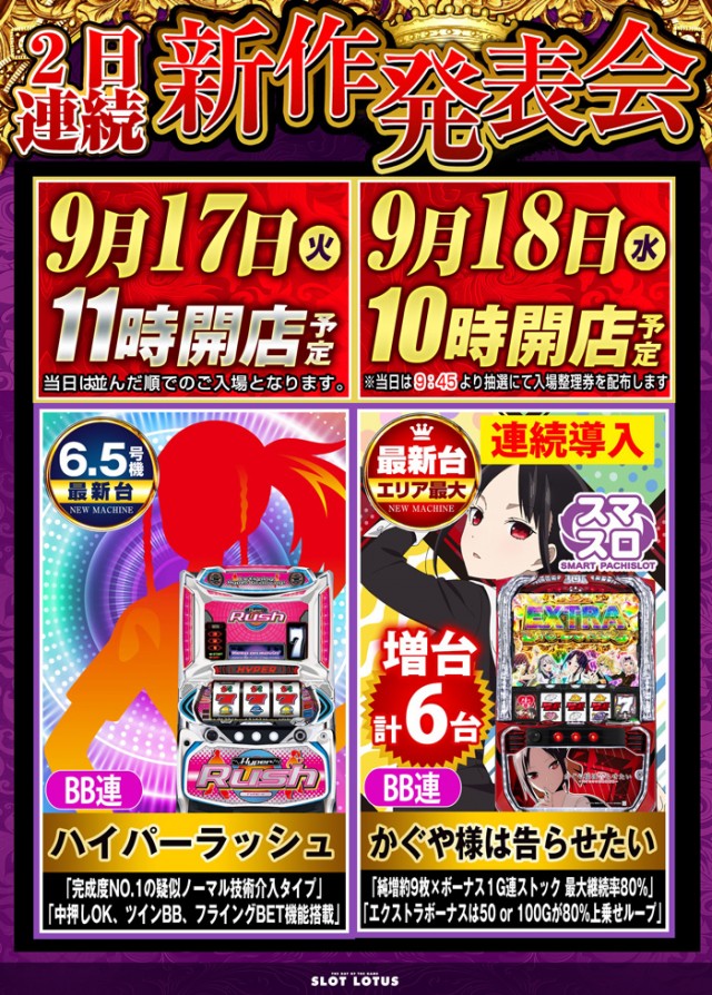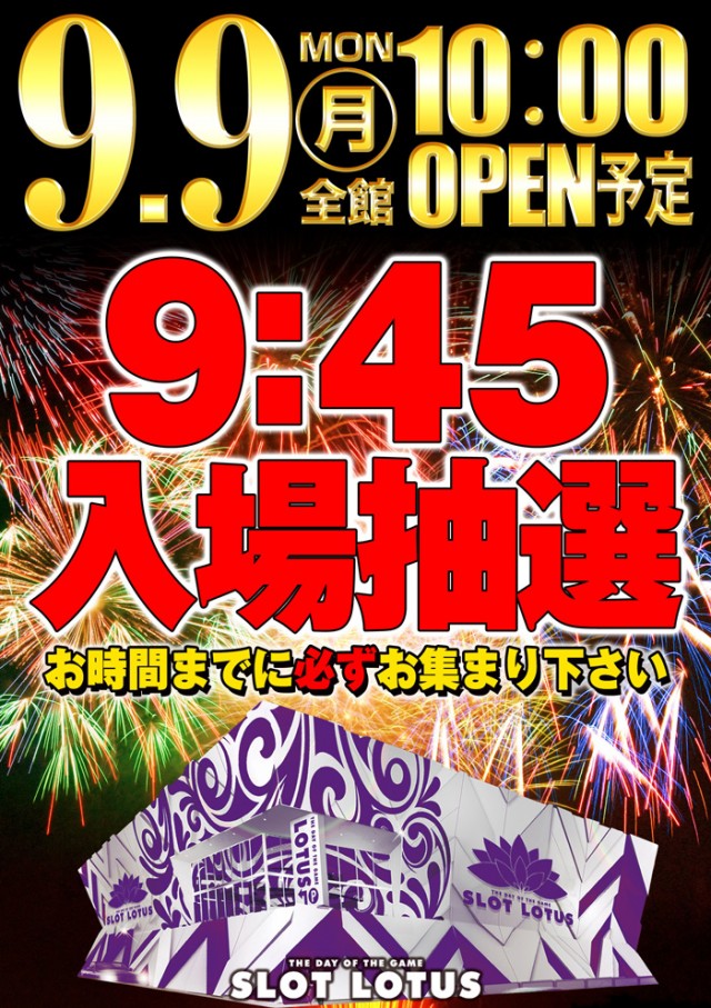 本日SLOTLOTUSは9:45☆抽選入場☆になりますので、是非ご来店下さい